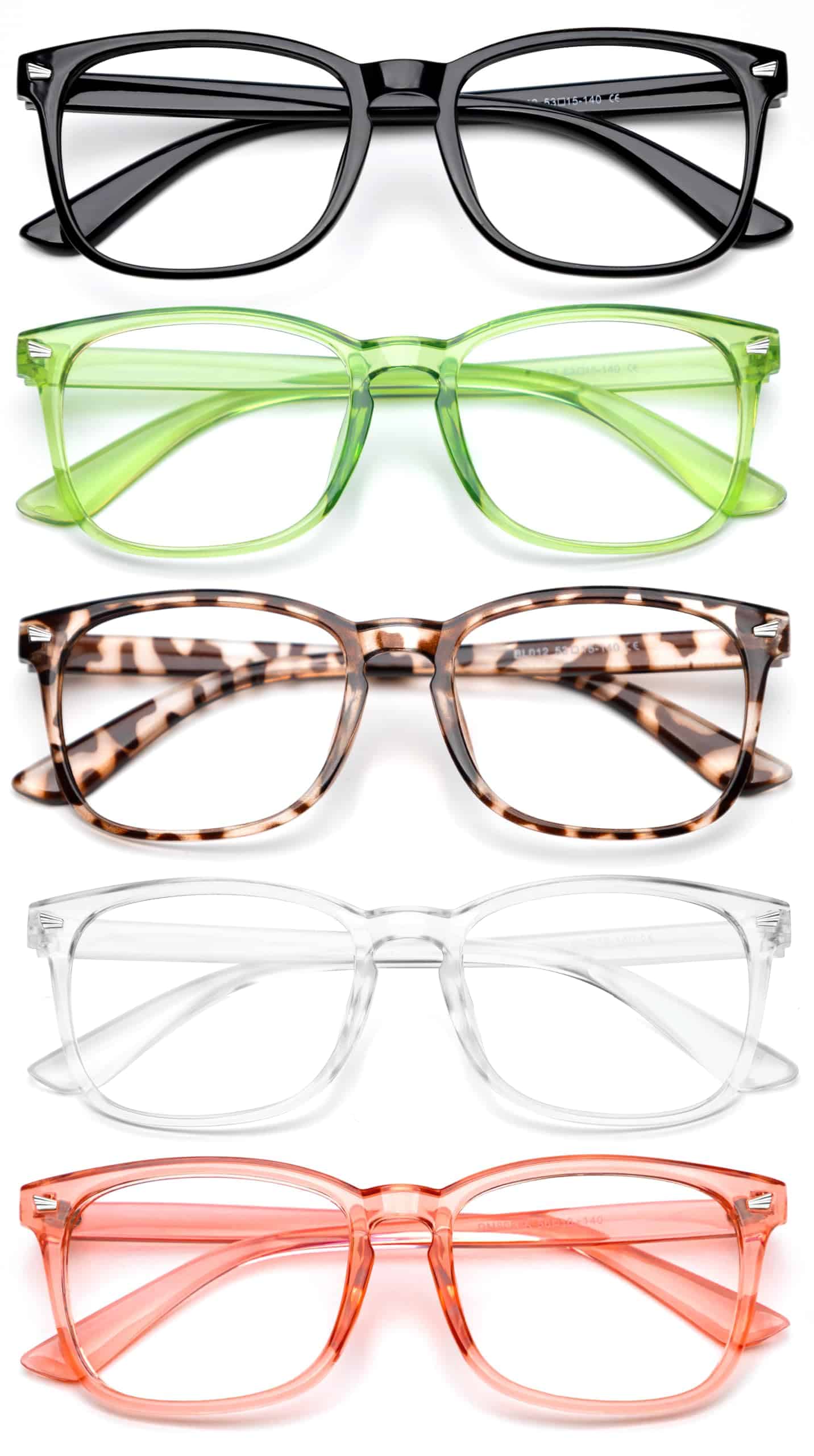The variety of frame styles in this 5-pack is particularly handy. We keep different pairs at our desks, in our bags, and by the TV. The square frames have a modern look that works well in both casual and professional settings. Though made of plastic, they’re lightweight enough that you might forget you’re wearing them.