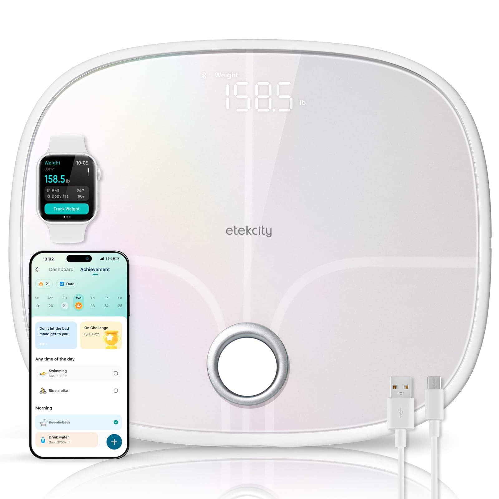 We recently tested the Etekcity Smart Scale in rainbow white, and it’s quickly become our bathroom staple. The sleek design looks modern without being an eyesore. What impressed us most was the rechargeable battery – no more hunting for coin batteries when the scale dies!