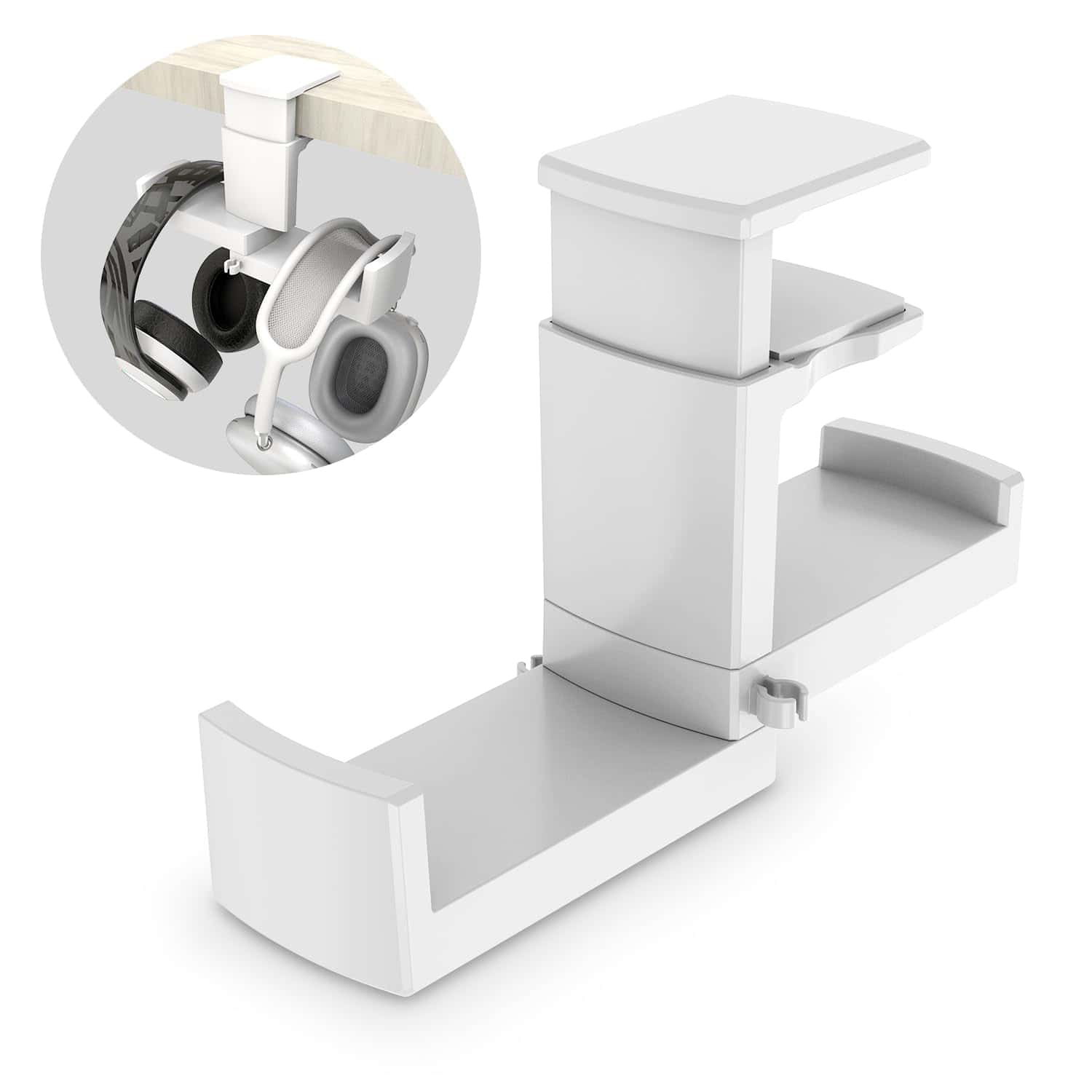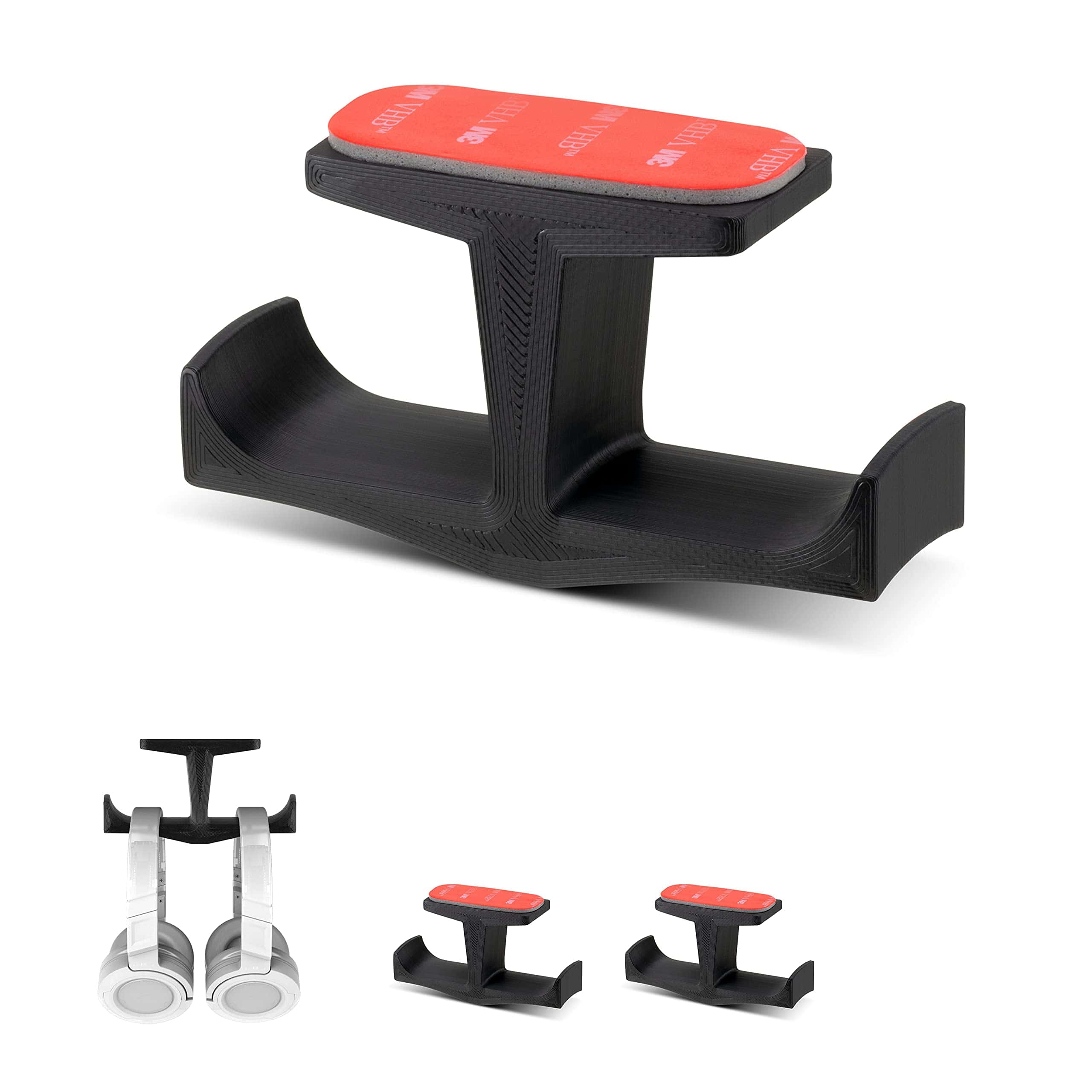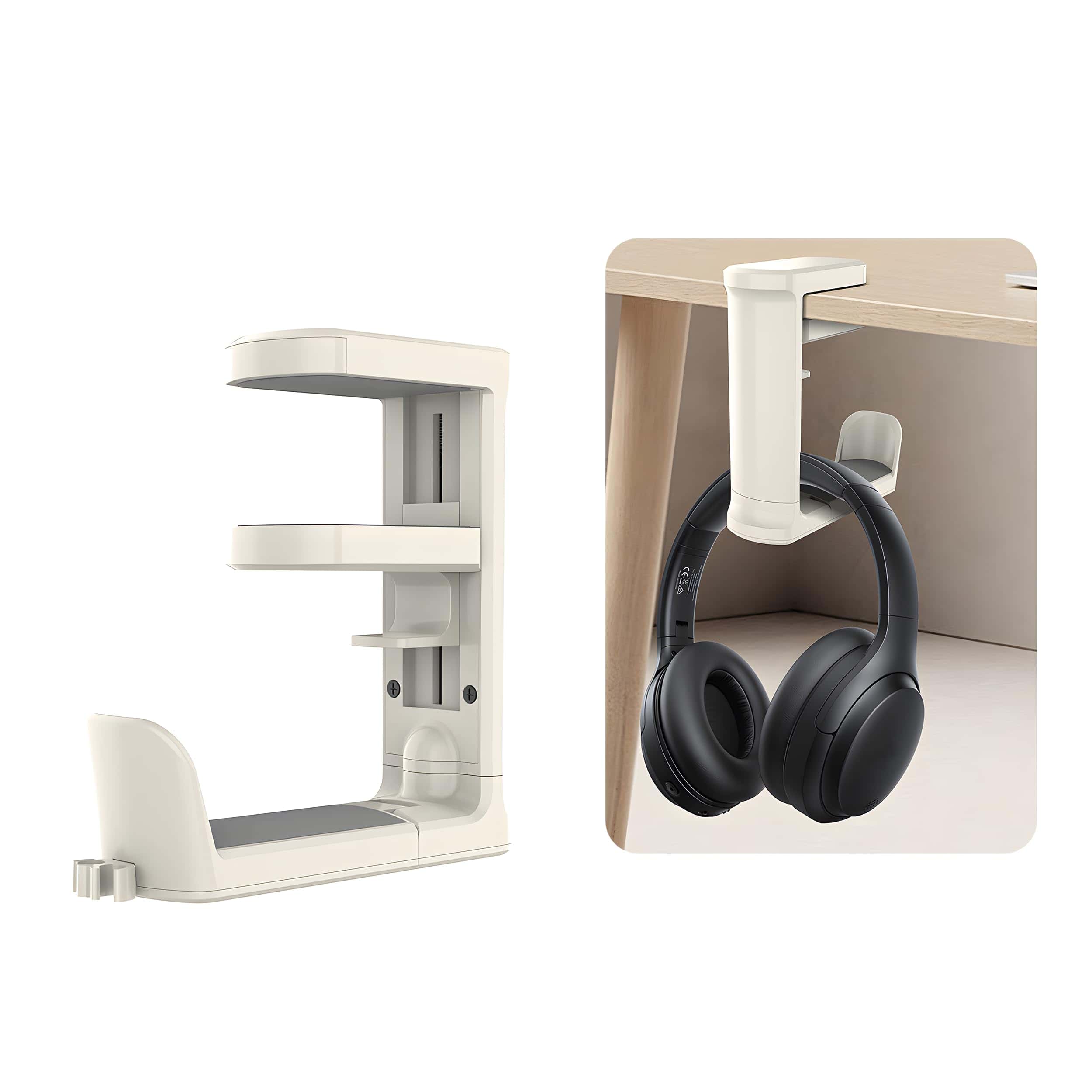 - Holds two headphones to maximize desk space