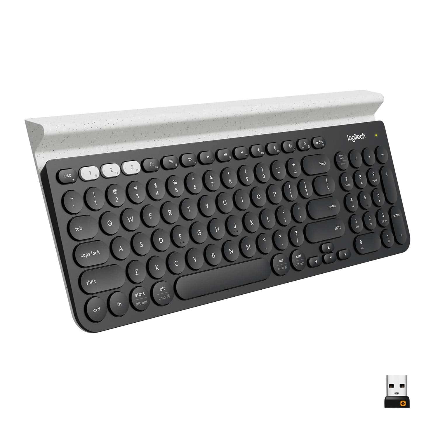 The K780 Multi-Device keyboard works with computers, tablets, and phones, letting you switch between devices with a button press. Its built-in device cradle holds your phone or tablet at a perfect viewing angle.